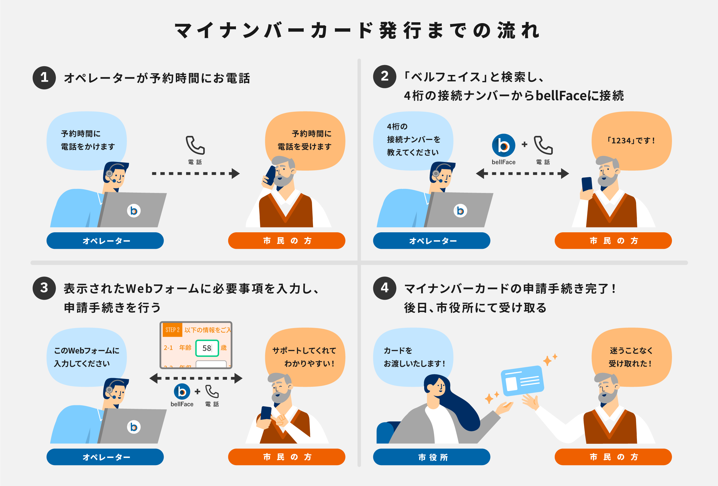 本サービスは、ベルフェイスが開発・販売を行う電話面談システム「bellFace(ベルフェイス)」とベルシステム24のコンタクトセンター運用知見を活用し、企業や自治体と生活者間における煩雑な手続きを、電話と映像を同時に繋ぎリモートで支援するサービスとなります。画面を共有しながらマイナンバーカードの申請サポートを行うため、市民の皆様は来庁することなく対面に近い感覚で申請手続きを完結することができます。